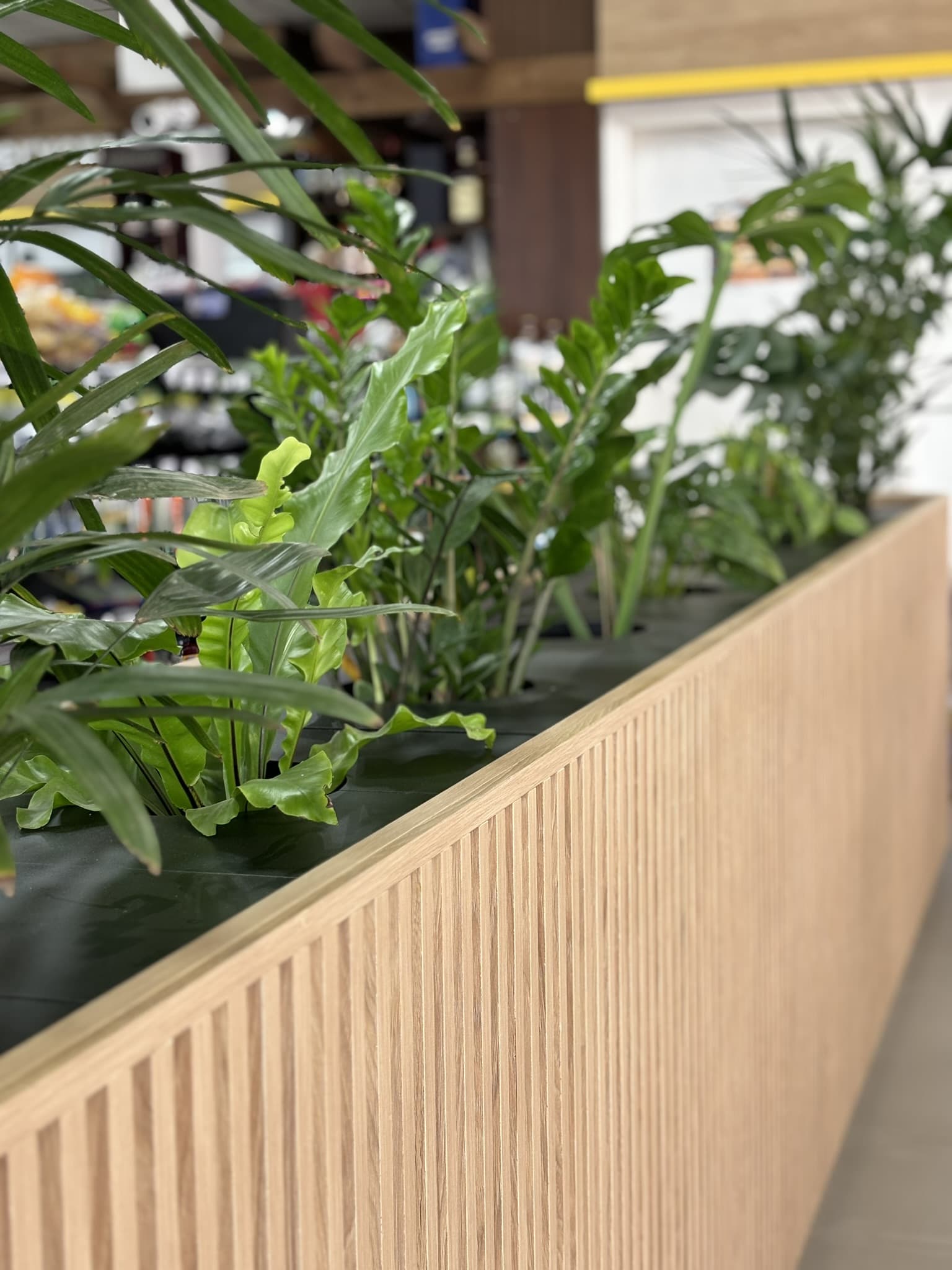 Proponemos nuevos muebles que ayudarán a delimitar los distintos sectores: un mueble impulsivo para ordenar la circulación de la zona de cobro y un mueble separador que hará de filtro entre el minimarket y la cafetería a través de la incorporación de plantas.