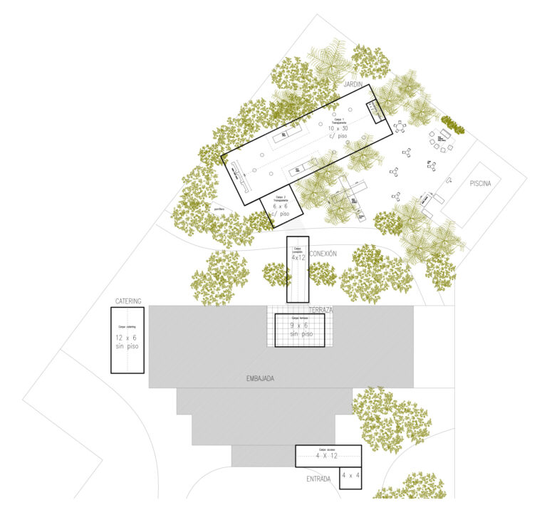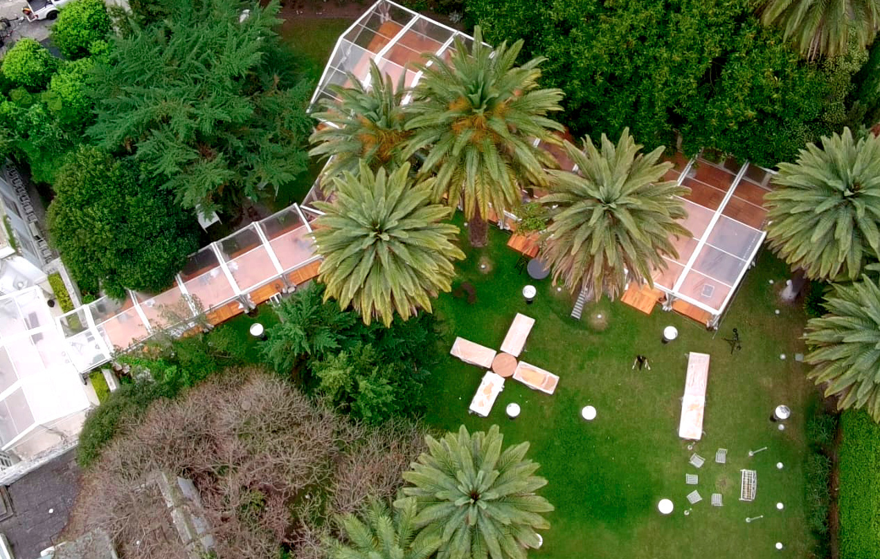 El resultado fueron 440m2 de carpas transparentes implantadas de forma estratégica entre los majestuosos árboles y palmeras del terreno sin bloquear la visual de los mismos.