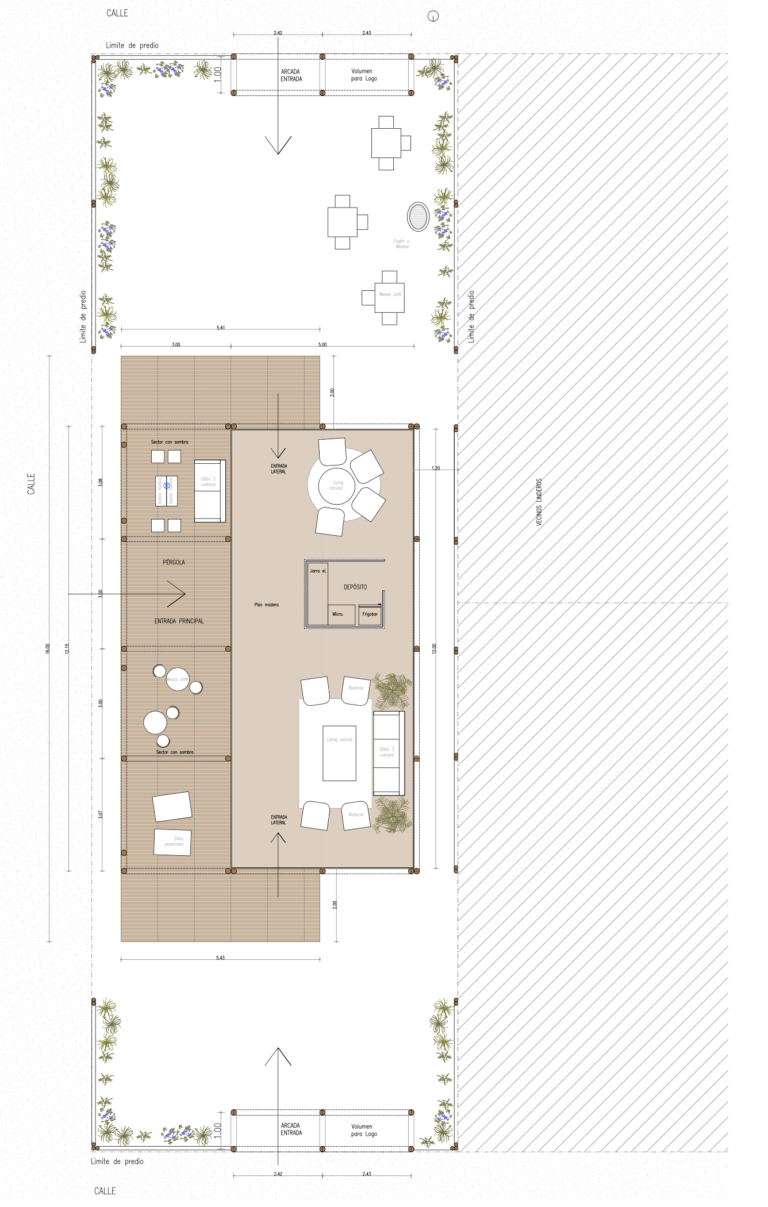 El diseño a tres aguas respondió a dos estrategias. Por un lado aprovechar recursos, acentuando y re dibujando la propia forma de la carpa. Y por otro generar una gran fachada institucional con altura hacia el camino principal. Esto lo logramos anexando en todo el largo de la carpa una inmensa galería de 4m de alto.