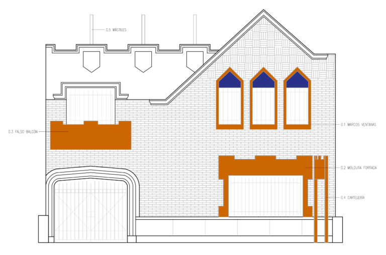 Para el diseño tomamos como punto de partida algunos de los detalles de la fachada antigua que evocaban a un Castillo, como el remate de la cornisa y la moldura de la ventana de planta baja. También tomamos como elemento a repetir los bajo relieves existentes en forma de escudo o casita invertida, agregándolos al diseño de la nueva reja para incorporar la escala del niño.